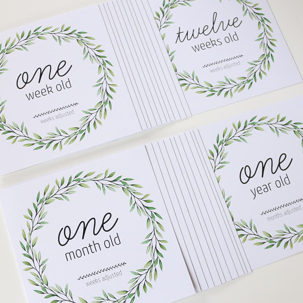 Each card has space on the front to document your baby's adjusted age (see pictures for example), as well as space on the back to document the details of each milestone.